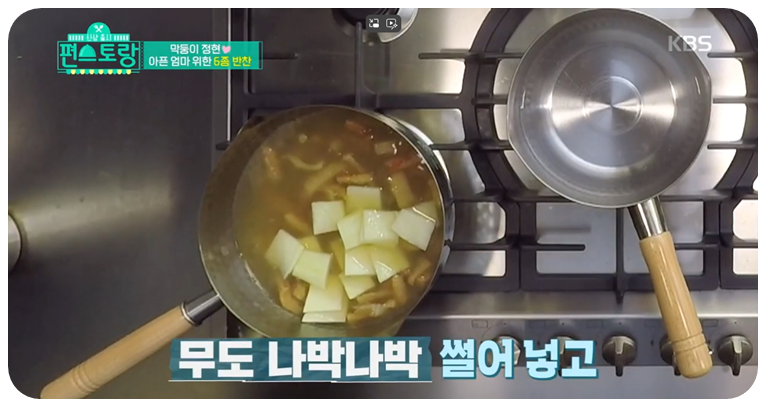 4. 무 1/3개를 나박썰기 한 후 ➂의 황태국에 넣어줍니다.