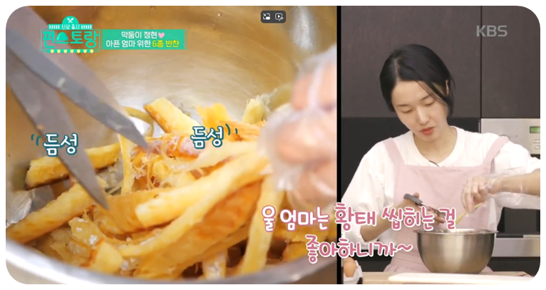 황태채 1주먹, 만능간장 3T, 식용유 1T, 들기름 1T, 멸치육수, 달걀 1개, 까나리액젓 2T, 쪽파 1T, 무 1/3개
